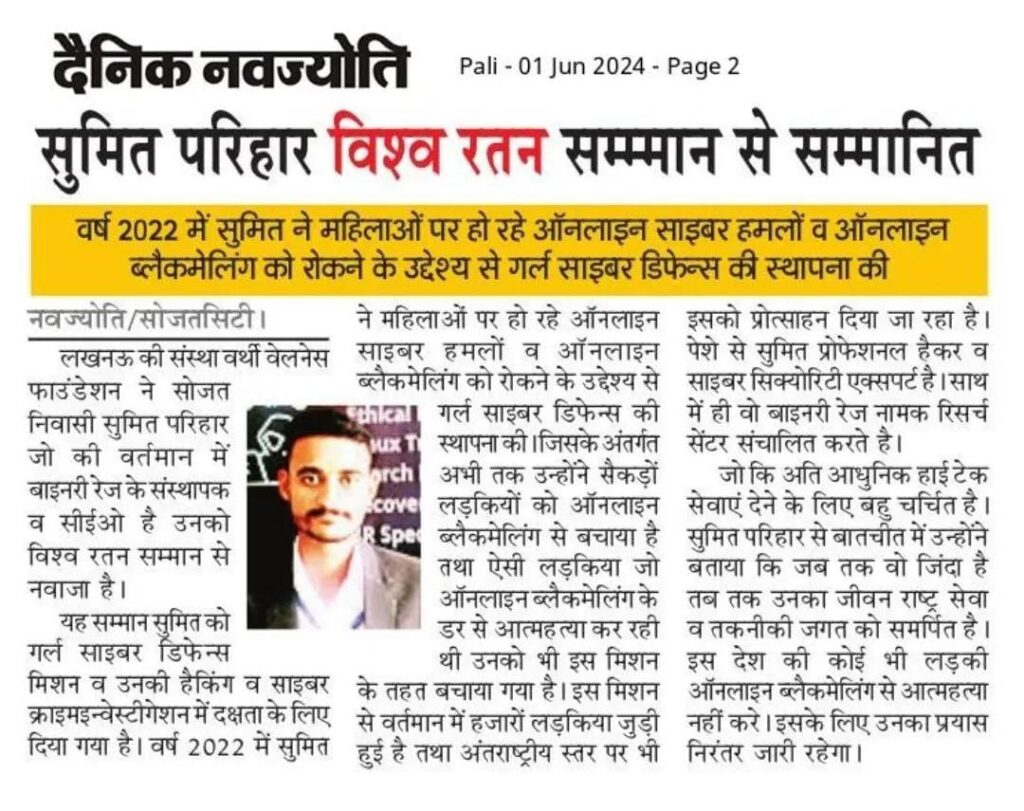 यह सम्मान सुमित को गर्ल साइबर डिफेन्स मिशन व उनकी हैकिंग व साइबर क्राइम इन्वेस्टीगेशन में दक्षता के लिए दिया गया है। वर्ष 2022 में सुमित ने महिलाओं पर हो रहे ऑनलाइन साइबर हमलों व ऑनलाइन ब्लैकमेलिंग को रोकने के उद्देश्य से गर्ल साइबर डिफेन्स की स्थापना की। जिसके अंतर्गत अभी तक उन्होंने सैकड़ों लड़कियों को ऑनलाइन ब्लैकमेलिंग से बचाया है तथा ऐसी लड़किया जो ऑनलाइन ब्लैकमेलिंग के डर से आत्महत्या कर रही थी उनको भी इस मिशन के तहत बचाया गया है। इस मिशन से वर्तमान में हजारों लड़किया जुड़ी हुई है तथा अंतराष्ट्रीय स्तर पर भी इसको प्रोत्साहन दिया जा रहा है। पेशे से सुमित प्रोफेशनल हैकर व साइबर सिक्योरिटी एक्सपर्ट है। साथ में ही वो बाइनरी रेज नामक रिसर्च सेंटर संचालित करते है जो कि अति आधुनिक हाई टेक सेवाएं देने के लिए बहु चर्चित है। सुमित परिहार से बातचीत में उन्होंने बताया कि जब तक वो जिंदा है तब तक उनका जीवन राष्ट्र सेवा व तकनीकी जगत को समर्पित है। इस देश की कोई भी लड़की ऑनलाइन ब्लैकमेलिंग से आत्महत्या नहीं करे। इसके लिए उनका प्रयास निरंतर जारी रहेगा।