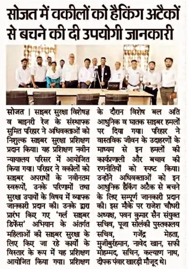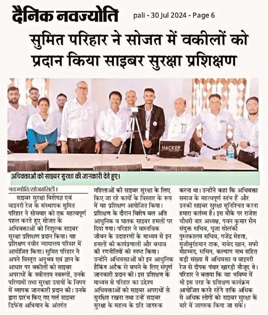 सोजत: प्रसिद्ध साइबर सुरक्षा विशेषज्ञ एवं बाइनरी रेज़ के संस्थापक सुमित परिहार ने आज एक महत्वपूर्ण पहल करते हुए सोजत के अधिवक्ताओं को निःशुल्क साइबर सुरक्षा प्रशिक्षण प्रदान किया। यह प्रशिक्षण नवीन न्यायालय परिसर में आयोजित किया गया।