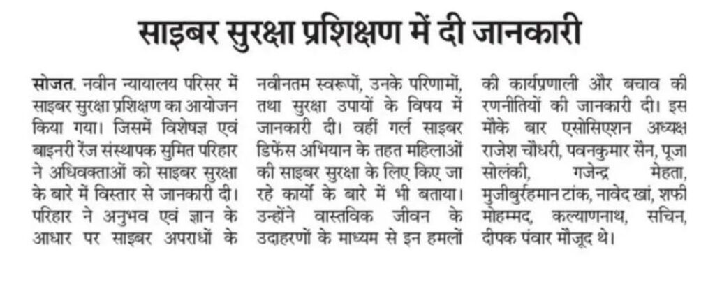 सुमित परिहार ने सोजत में वकीलों को प्रदान किया साइबर सुरक्षा प्रशिक्षण