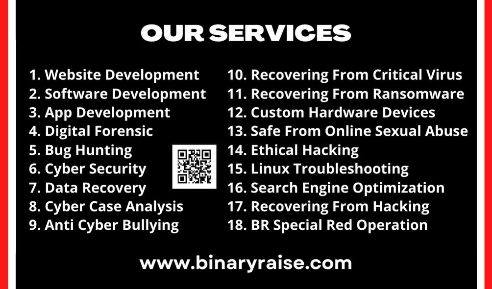 Binary Raise की सेवाओं में Hacking, Cyber Crime Investigation, Anti Online Sexual Abuse, Data Recovery, Virus Removal, SEO, Forensics, Custom Cyber Devices, Suicide Prevention Support और Website/App Development शामिल हैं। यह टीम न सिर्फ टेक्निकल स्तर पर बल्कि भावनात्मक और साइकोलॉजिकल स्तर पर भी लड़कियों को सपोर्ट देती है।